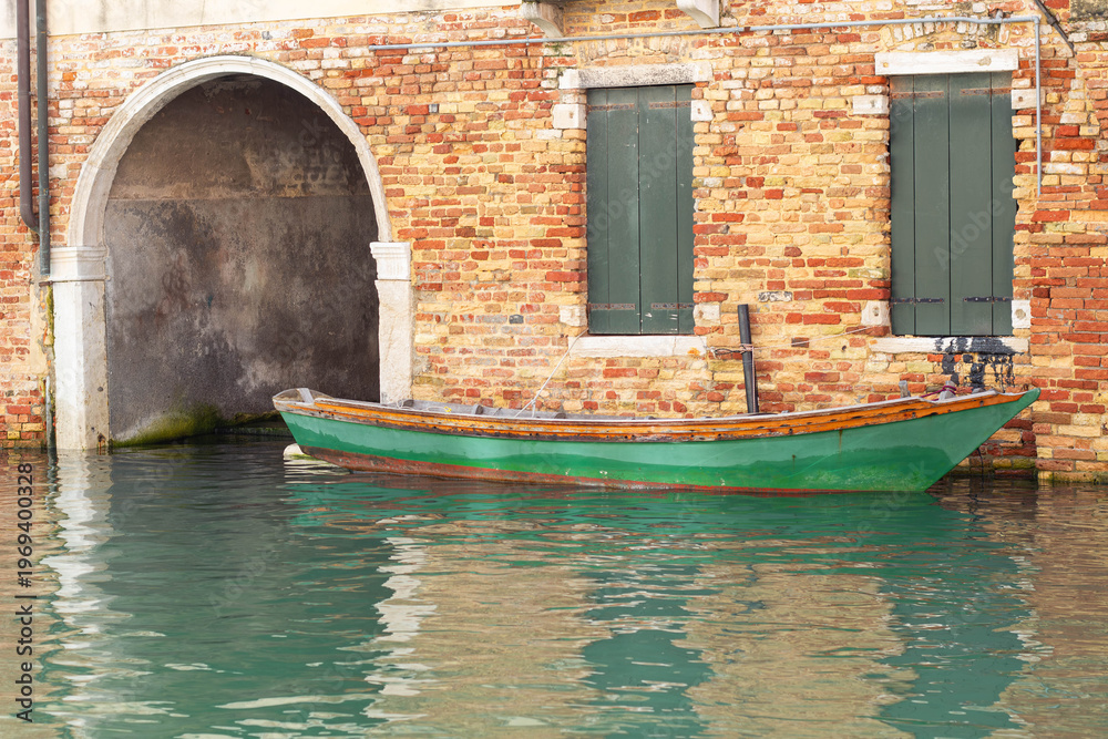Green wooden boat moored beside a weathered brick wall with arched entrance and green shutters reflecting in the calm water of a canal in Venice, Italy #1969400328