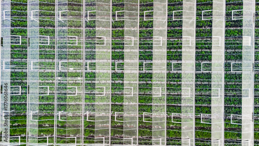 Greenhouse aerial drone view from above, large industrial greenhouses for growing vegetables, modern plantation glasshouse area background, agriculture in the Netherlands #1776061646