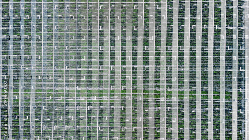 Greenhouse aerial drone view from above, large industrial greenhouses for growing vegetables, modern plantation glasshouse area background, agriculture in the Netherlands #1776061681