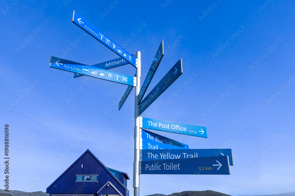 Greenland Ilulissat signs that show location of Ilulissat city and services #1908816190