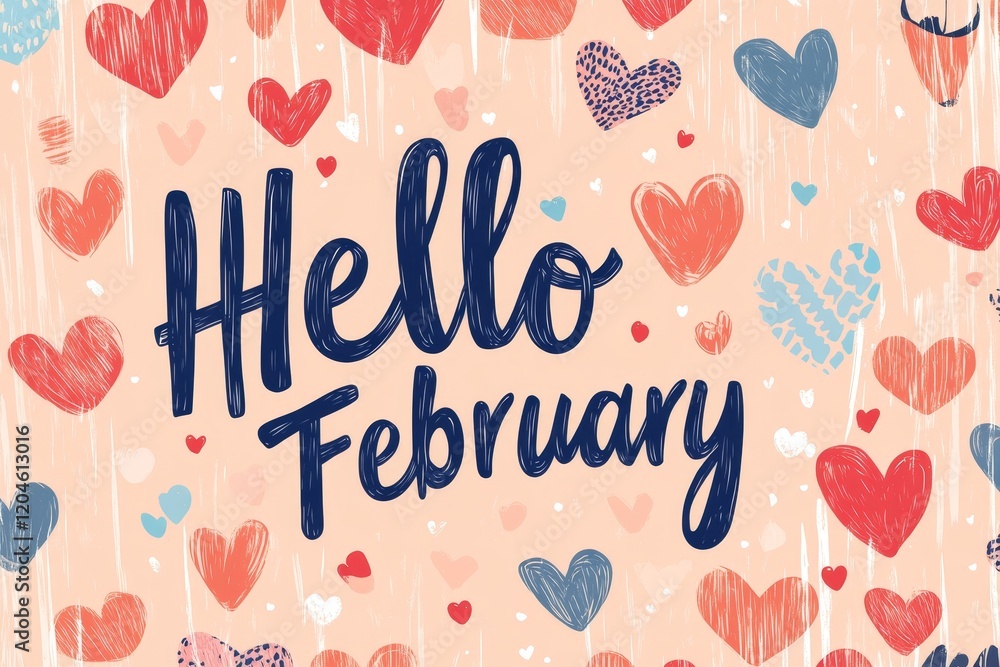 Greetings February, red hearts text; modern design for Valentine's Day #1204613016