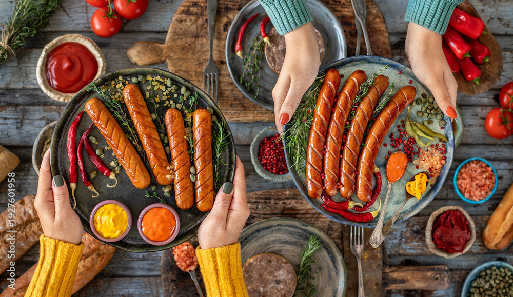 Grilled bratwurst and sausages in the plate at the hands of two women. #1927601958
