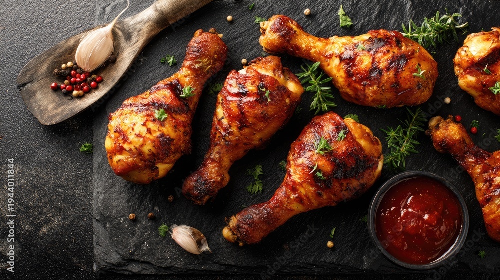 Grilled Chicken Drumsticks on Rustic Black Slate with Herbs, Garlic, and Spicy Barbecue Sauce in a Gourmet Culinary Setting #1944011844