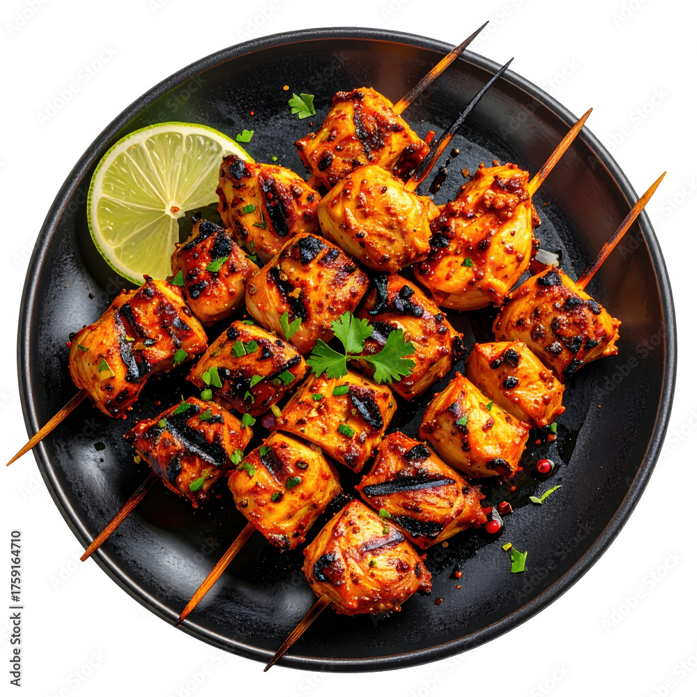 Grilled Chicken suya skewers with lime wedge on black plate top-down view isolated on white background #1759164710
