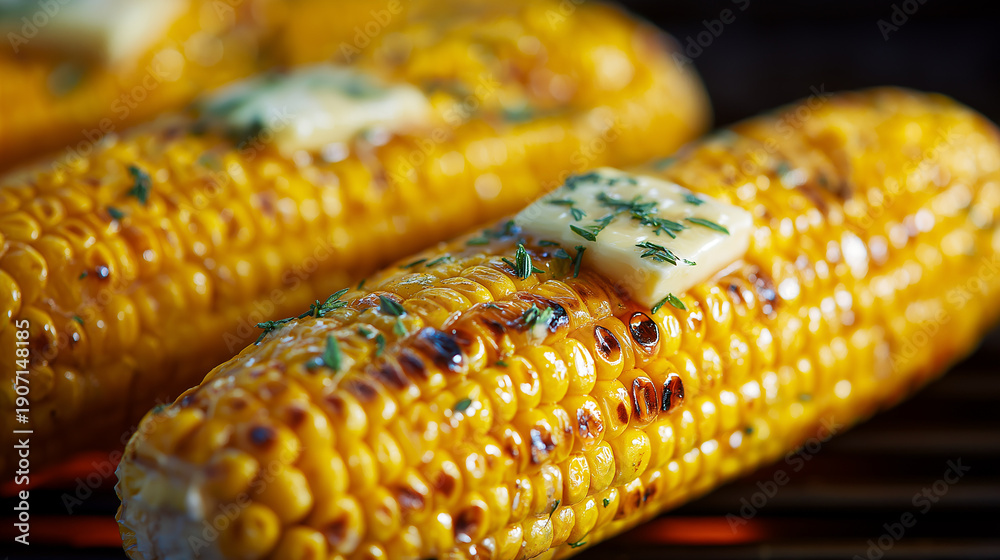 Grilled corn cobs sizzling on barbecue grill, butter melting with fresh herbs, celebrating summer outdoor cooking and healthy plant based eating #1907148185