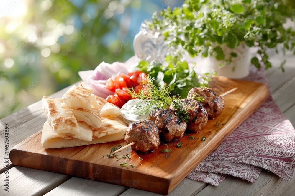Grilled meat skewers with pita bread and fresh salad #1967504697