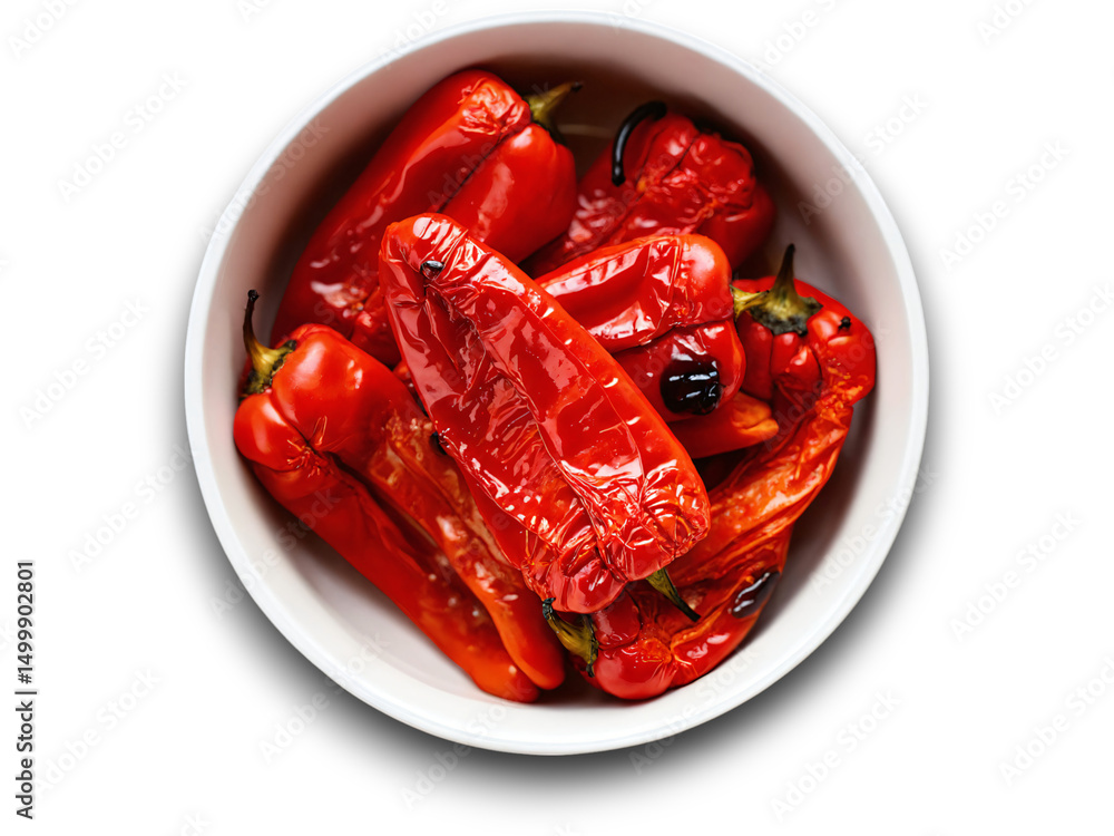 Grilled roasted red peppers in a white bowl, ready for cooking or snacking on the kitchen countertop #1499902801