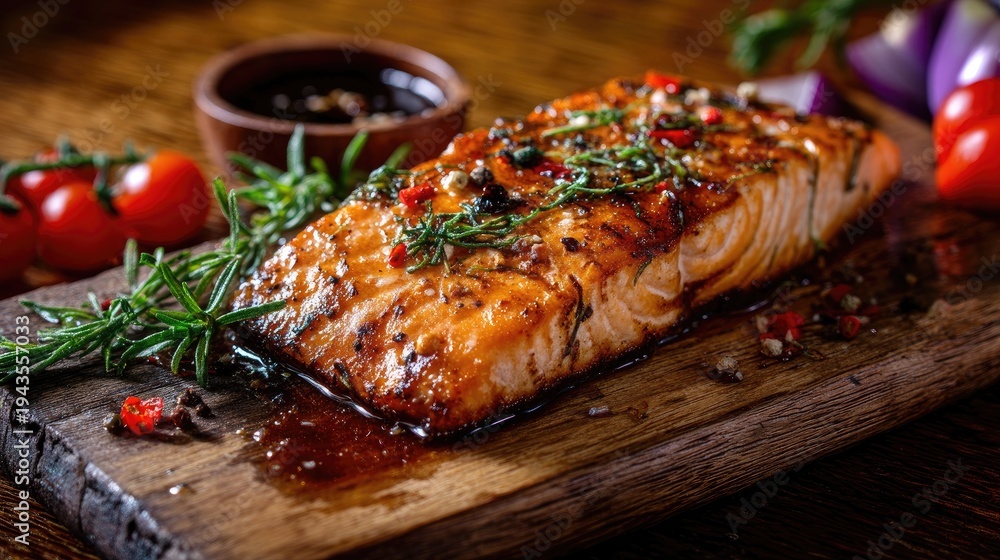 Grilled Salmon Fillet Glazed with Honey and Herbs Served on Rustic Wooden Board with Cherry Tomatoes and Bowl of Sauce #1943557033