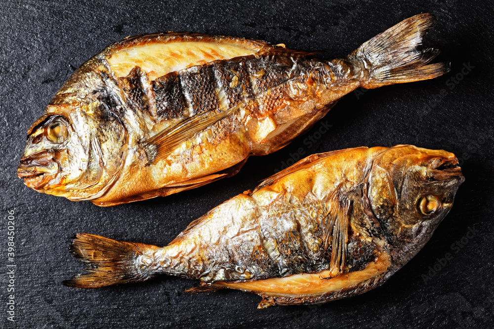 grilled whole sea bream fishies, top view #398450206