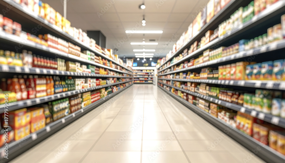Grocery store aisle with organized shelves filled with various packaged food products and neutral floor tiles under bright ceiling lights creating calm shopping atmosphere #1777979045