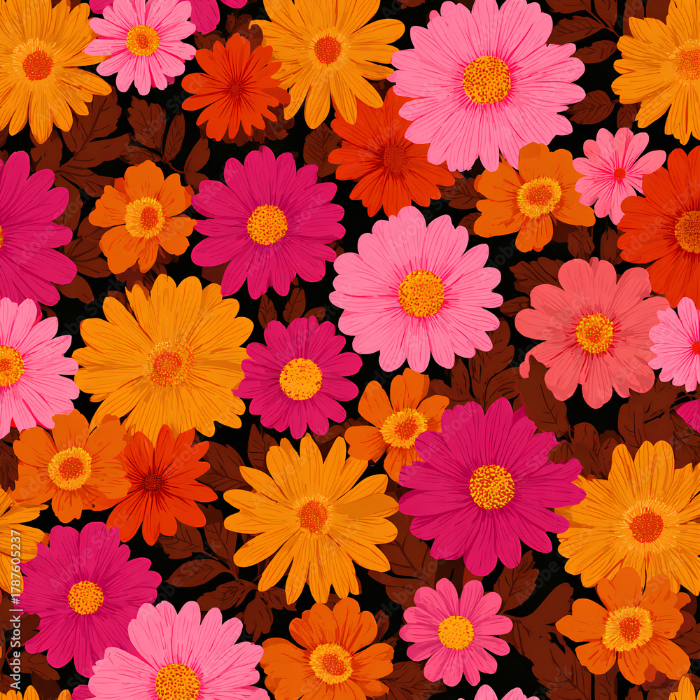 Groovy floral repeat pattern with bold 70s daisies in vibrant orange and pink palette featuring seamless vintage retro style design #1787605237
