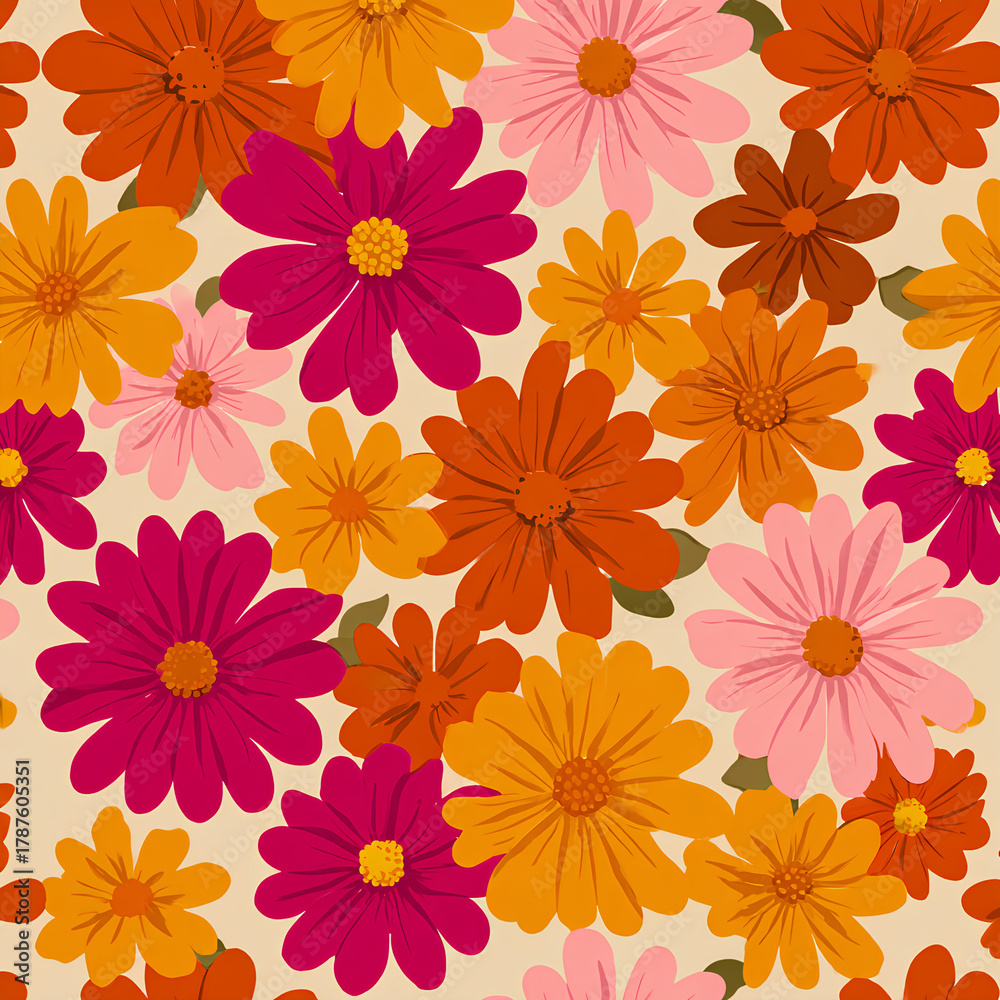 Groovy floral repeat pattern with bold 70s daisies in vibrant orange and pink palette featuring seamless vintage retro style design #1787605351