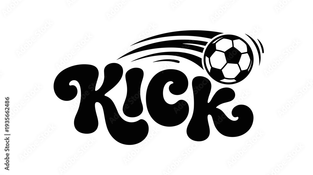 Groovy "KICK" text with soccer ball and motion lines, retro style #1935662486