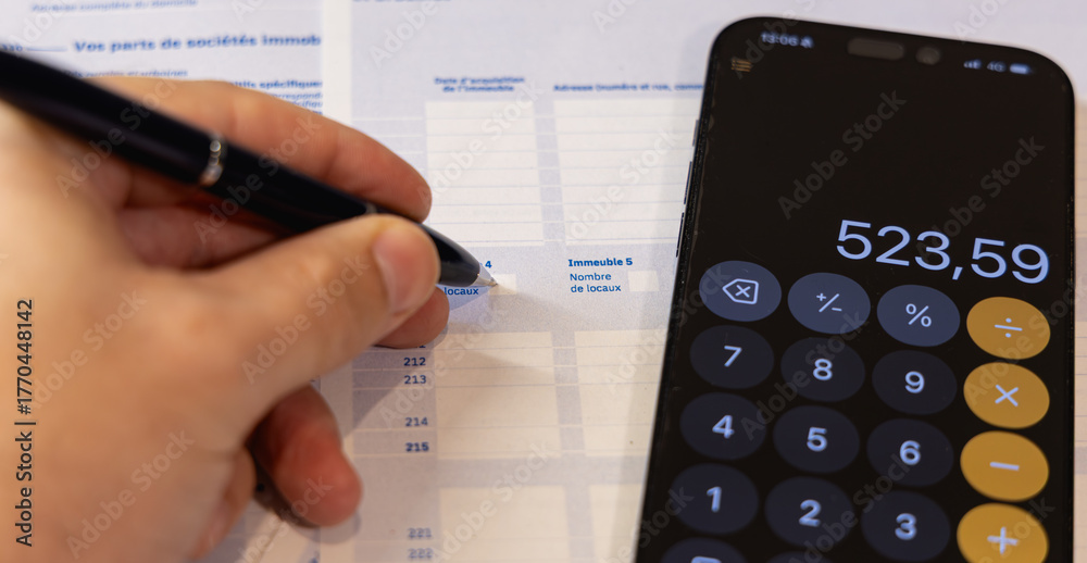 Gros plan sur une personne en train de remplir la déclaration des revenus des impôts pour l’année 2026 en France. #1770448142