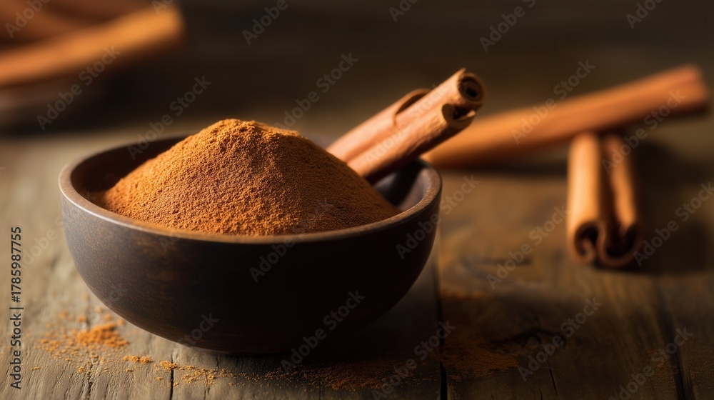 Ground cinnamon powder in a wooden bowl with cinnamon sticks. Generative AI #1785987755