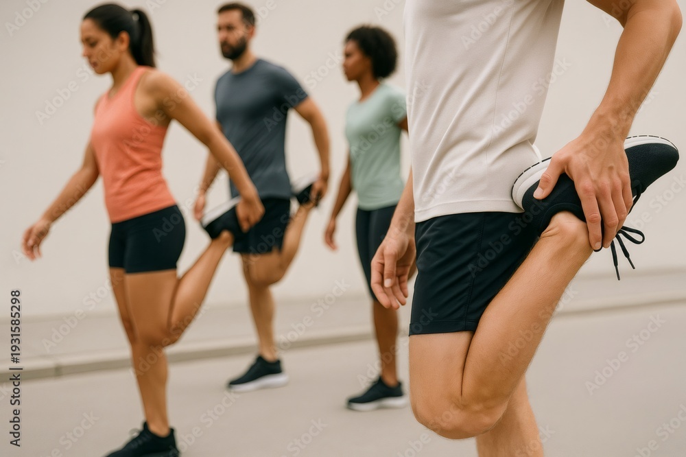 Group of active individuals performing warm up exercises, holding their ankles and stretching quadriceps muscles, preparing for a fitness session outdoors #1931585298