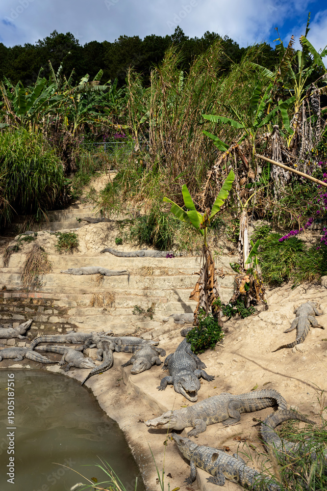 Group of crocodiles sunbathing on sandy riverbank near pond, tropical habitat with banana plants and steps, wildlife reptiles in daylight #1905187516