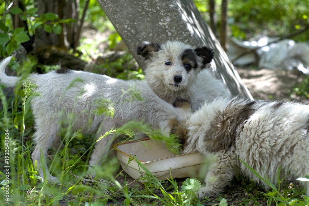 Group of cute homeless puppies eating from a plastic bowl outdoors in the grass. concept of animal rescue, kindness, and stray pet care #1923549884