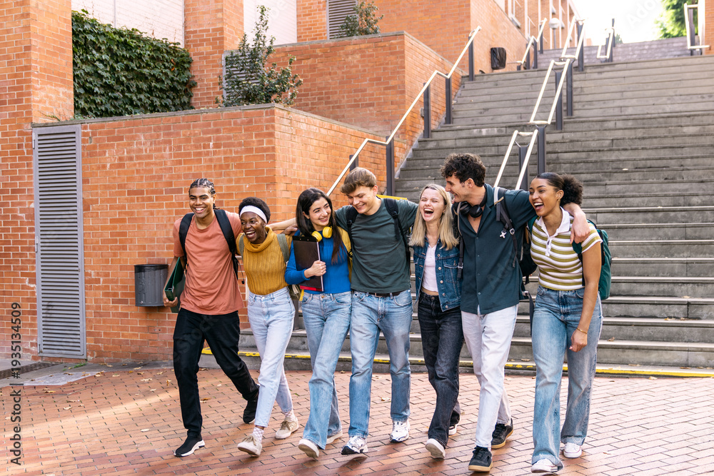 Group of diverse college students laughing and walking arm in arm on an outdoor university campus. Friendship and education #1935134509