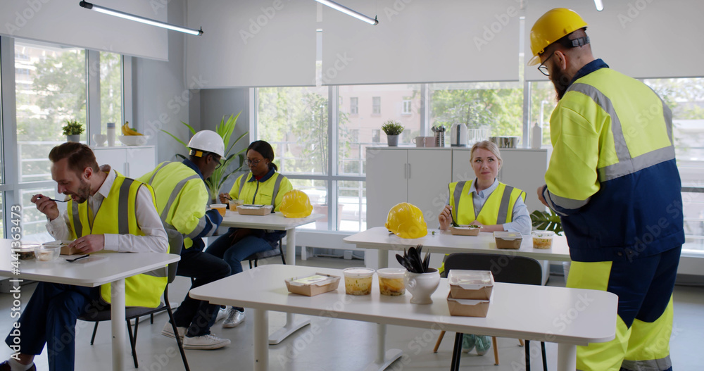 Group of diverse engineers and workers enjoy eating food and relax in canteen #441363473