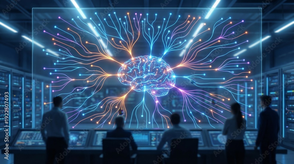 Group of engineers and data scientists monitoring an artificial intelligence brain connecting to a neural network, visualizing complex data and calculations within a bustling data center #1922507493
