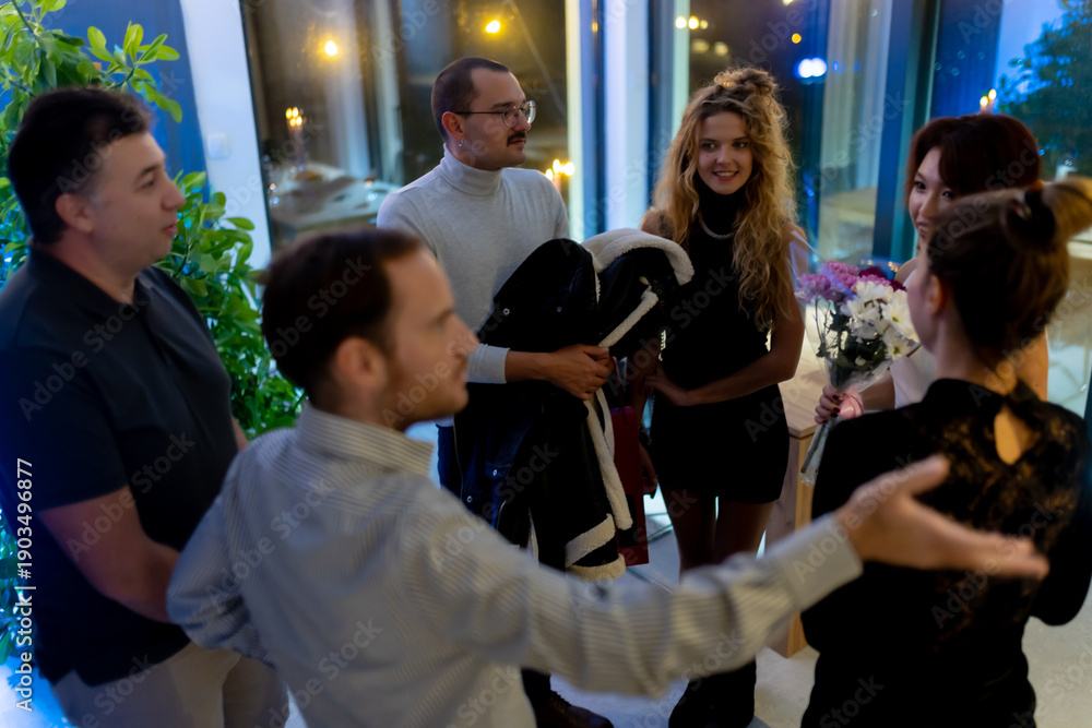 Group of friends enjoying a casual evening gathering with conversations and laughter #1903496877