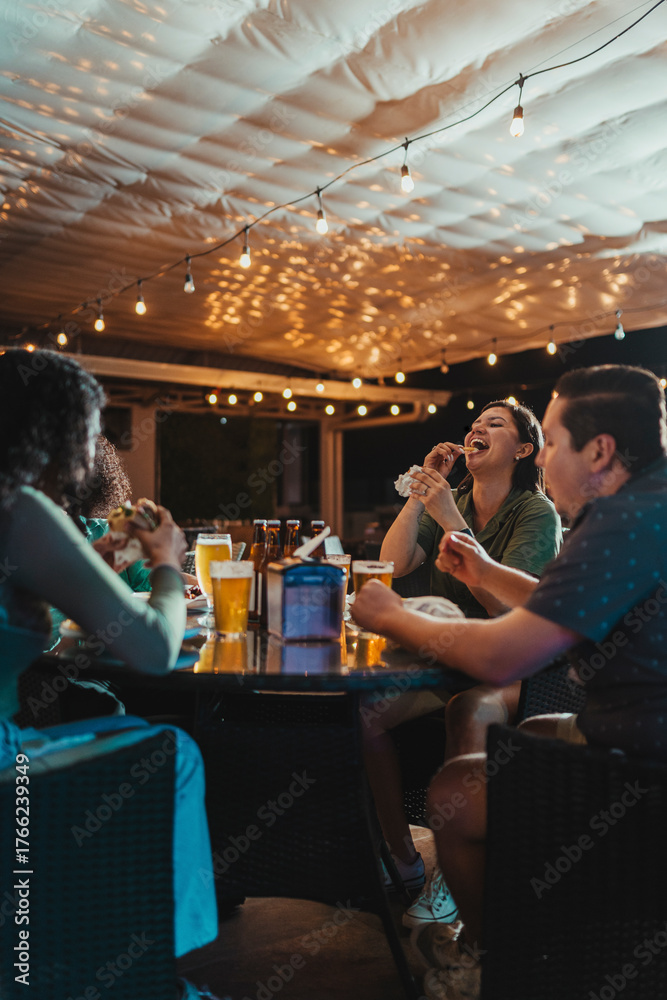 Group of friends enjoying burgers and beers at an outdoor restaurant during the evening. #1766239349