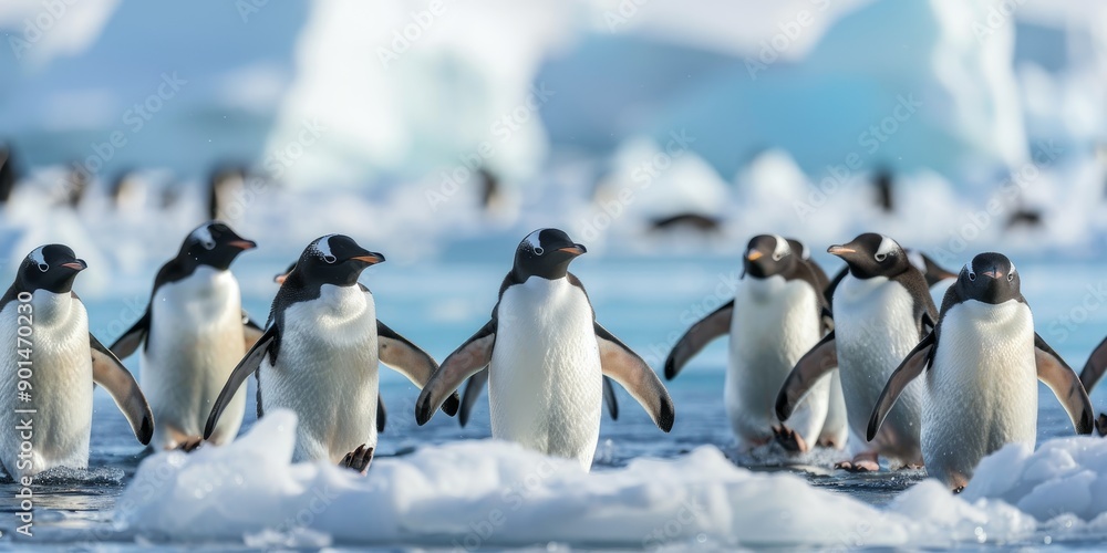 group of gentoo penguins walking on ice in antarctica with blue icebergs in the background. #901470230