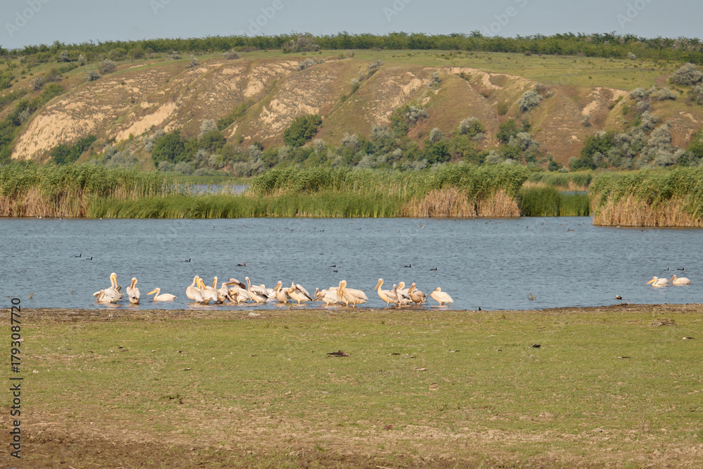 Group of great white pelicans Pelecanus onocrotalus on lake in southeast Romania #1793087720