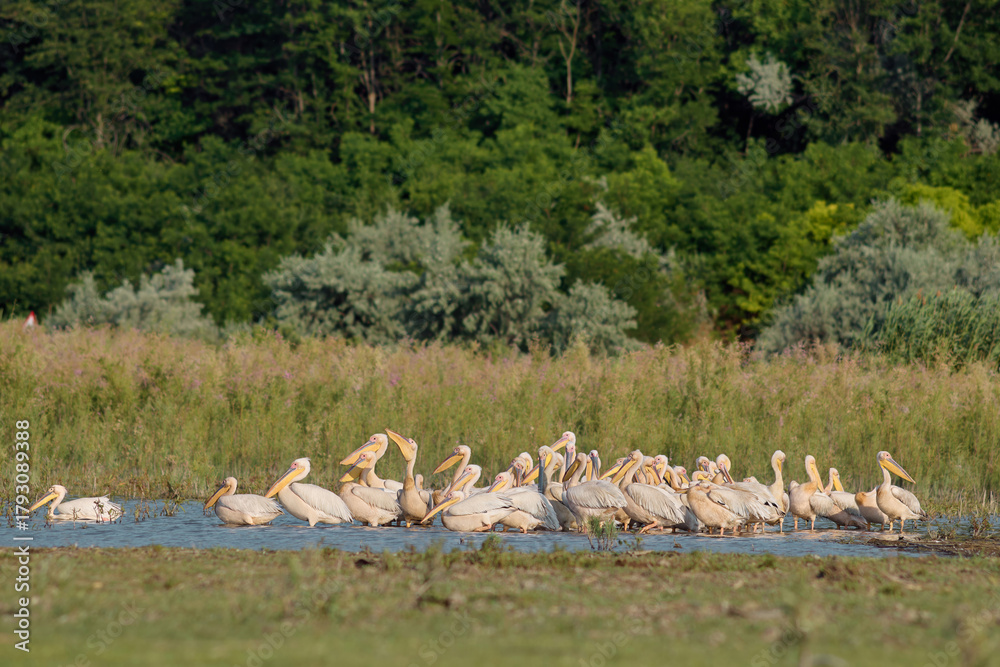 Group of great white pelicans Pelecanus onocrotalus on lake in southeast Romania #1793089388