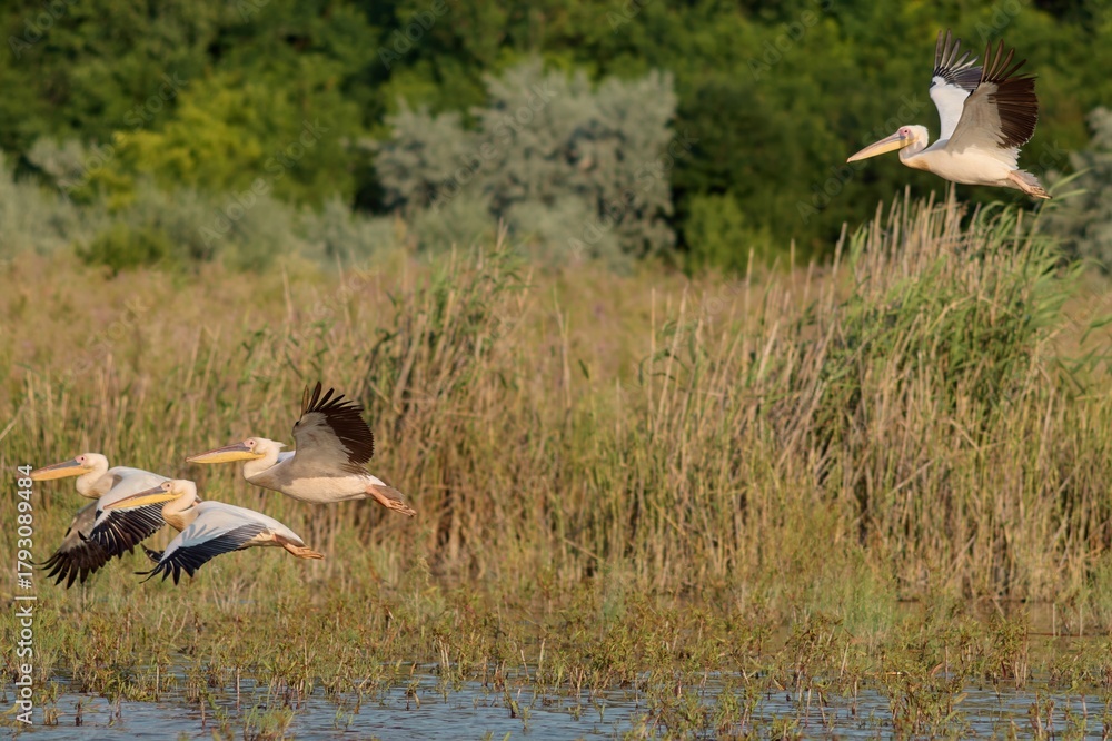 Group of great white pelicans Pelecanus onocrotalus on lake in southeast Romania #1793089484