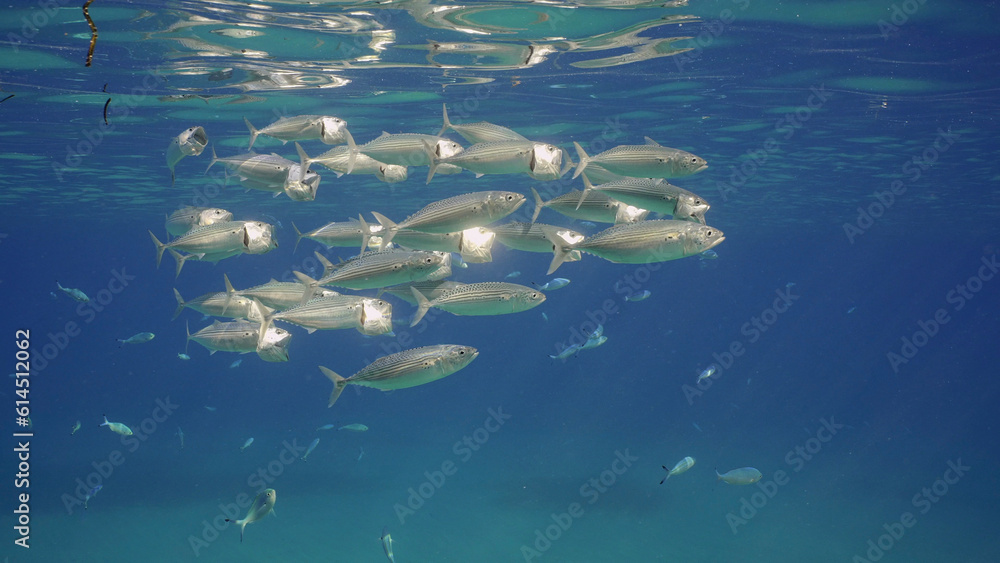 Group of Mackerel fish with open mouth swim under surface in blue water. Shoal of Indian Mackerel (Rastrelliger kanagurta) swim with open mouth ram feeds on macroplanton in ocean, Red sea, Egypt #614512062