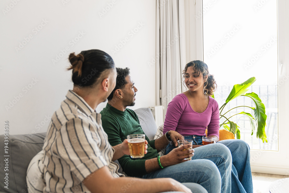 Group of multiethnic friends sitting on a sofa, drinking beer, and talking casually in a modern apartment. Enjoying a weekend get together #1943958536