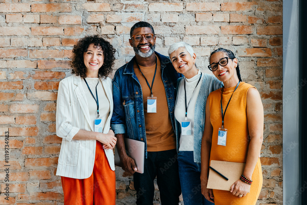 Group of professionals smiling and standing together in front of a brick wall #1119734983