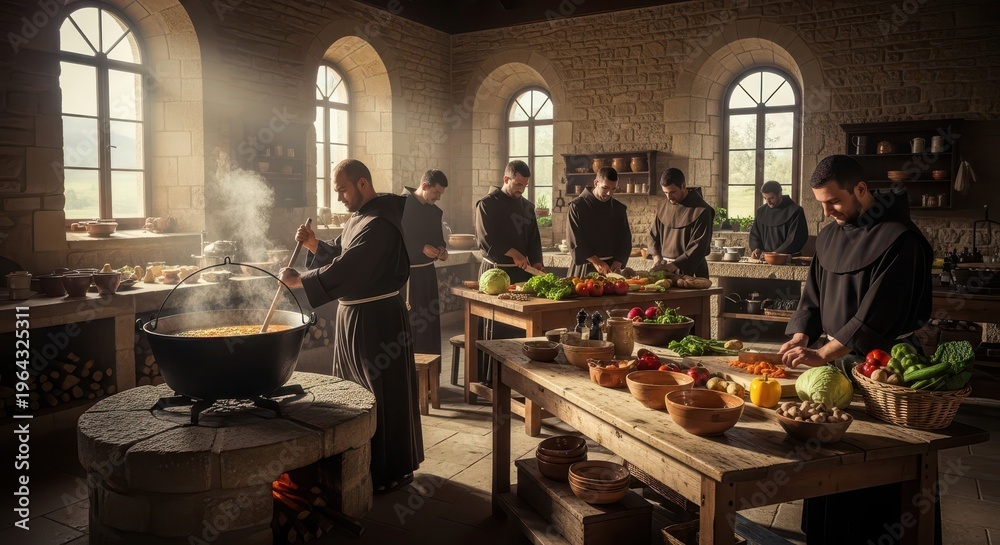 Group of religious men in robes preparing a large meal in a rustic stone kitchen #1964325311