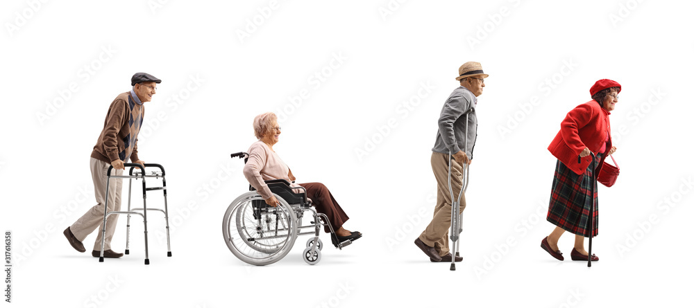 Group of senior people walking in a line with orthopedic equipment #317616358