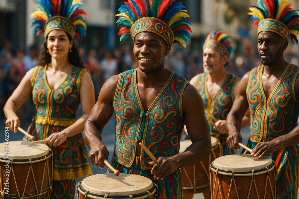 Group of traditional drummers in colorful tribal costumes performing in a lively street parade under bright daylight atmosphere outdoors. Ai generative #1973462314