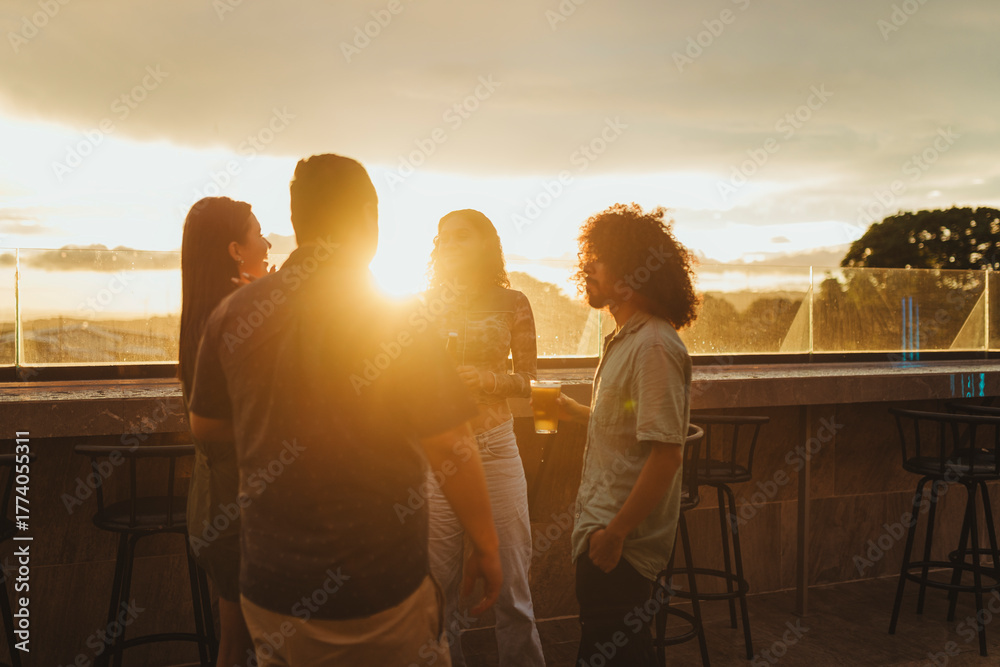 Group of young adults standing at a rooftop bar during sunset, enjoying drinks and socializing. #1774055311