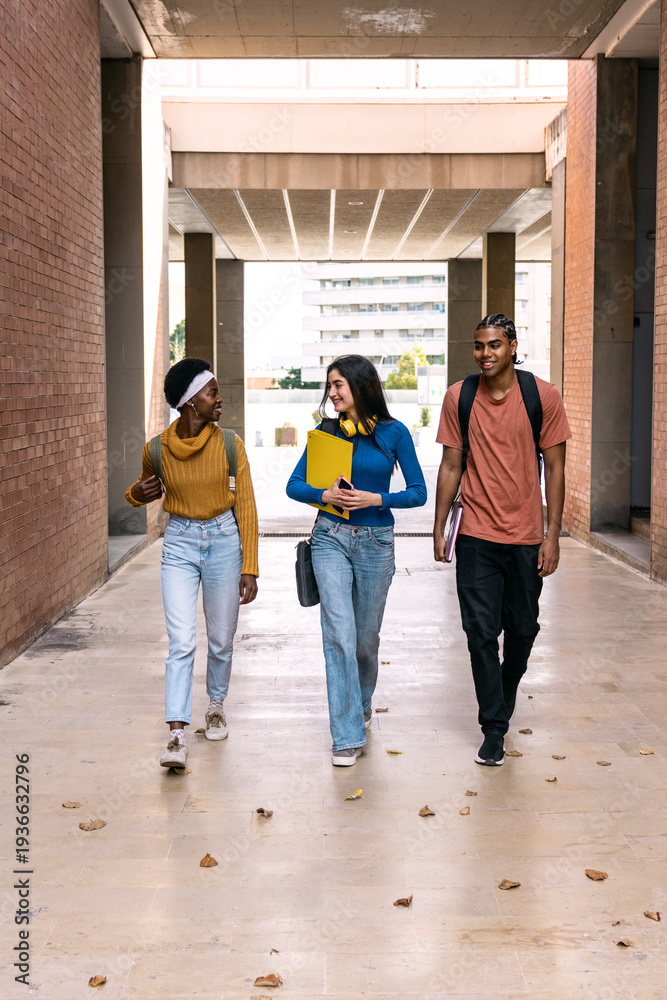 Group of young, diverse students walking and chatting on a modern university campus pathway, enjoying their education lifestyle #1936632796