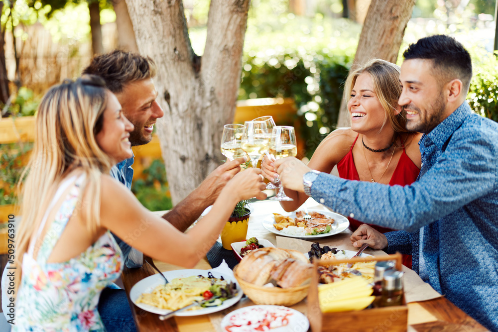 Group of young happy people toast with wine at lunch in restaurant during a sunny summer day #509763910