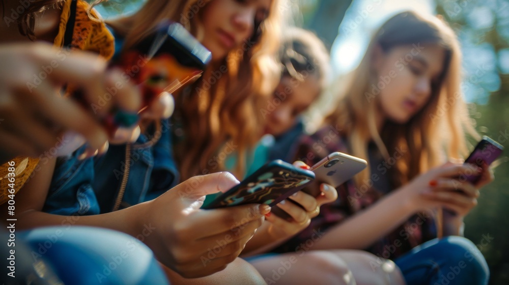 Group of young people engrossed in their smartphones, sitting together in natural light #804646386