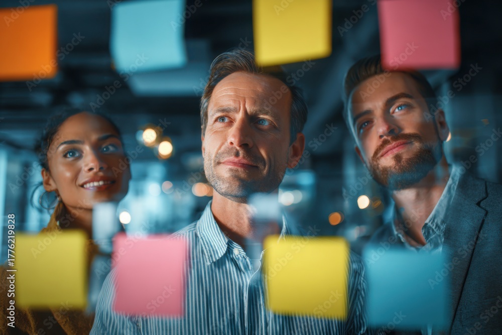 Group of young professionals collaborating during brainstorming session, using colorful sticky notes on glass wall in modern office. #1776219828
