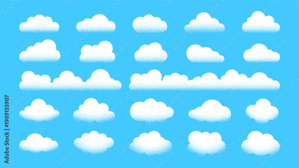 Grunge cloud. Grainy, cloudy shape. Simple noise texture on weather elements on blue background. Abstract dusty grain effect for cumulus cloud objects. Vector sky background #1909153907