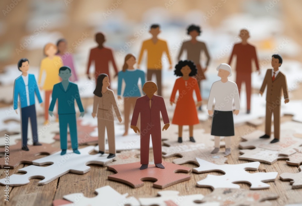 Grupo de diversas personas recortadas en papel paradas sobre piezas de rompecabezas interconectadas, simbolizando la inclusión y el trabajo en equipo #1571091607