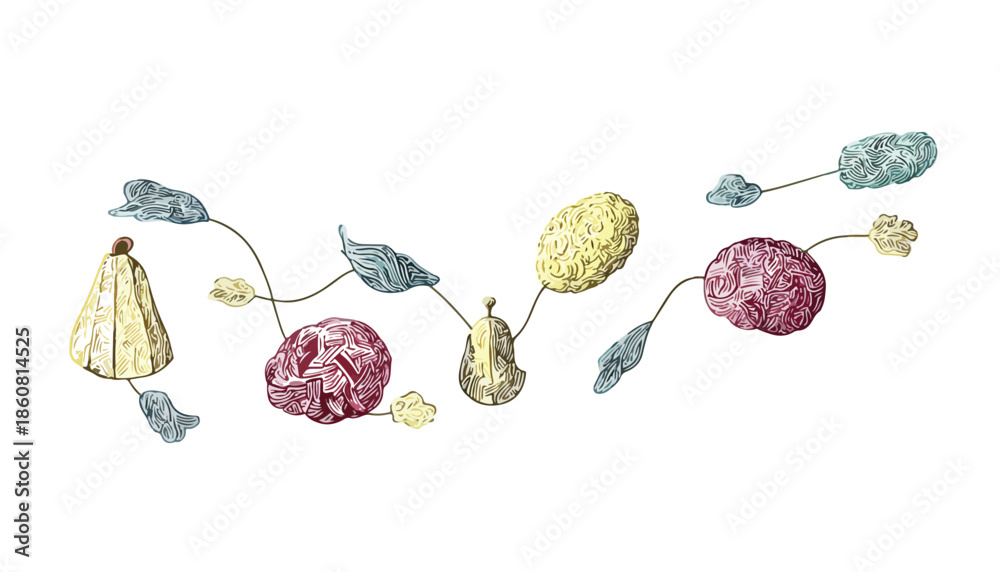 Guirnalda decorativa con ilustración dibujada a mano de formas orgánicas y colores pastel, ideal como elemento gráfico transparente para diseños delicados. #1860814525