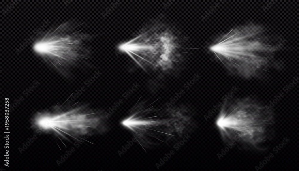 Gun shot with white fire and smoke effects vector set, weapon firing blast, realistic flying gun bullet explosion trails #1958037258
