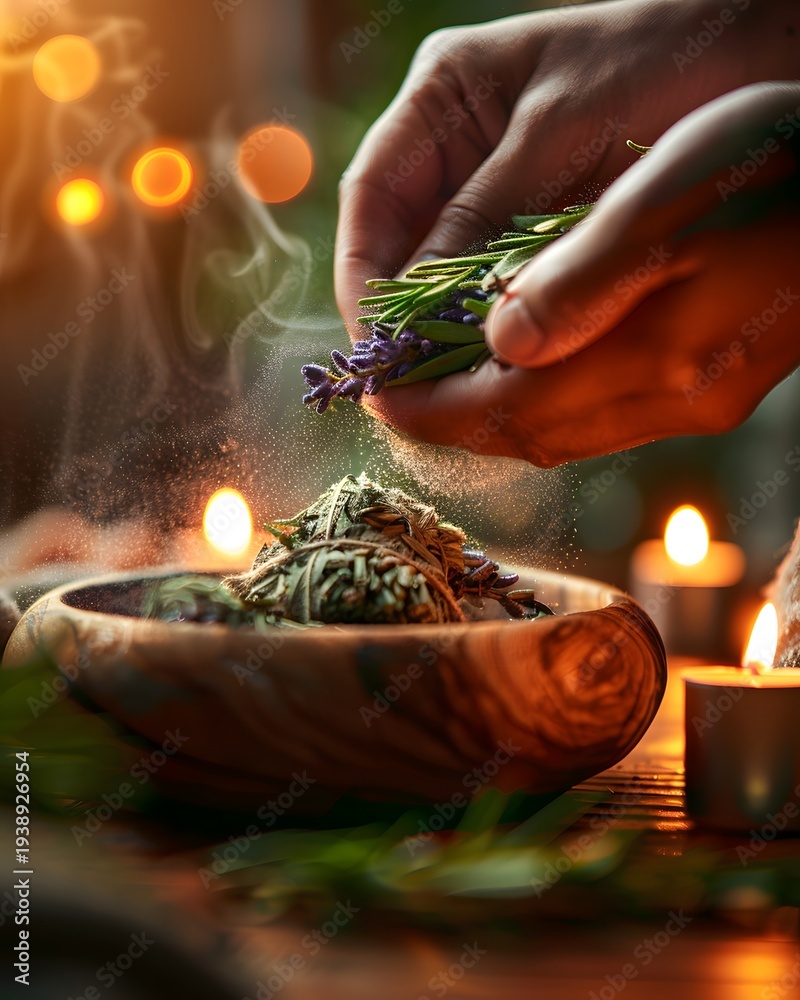 Hände räuchern Kräuter über Holzschale spirituelles Ritual mit Kerzenlicht #1938926954