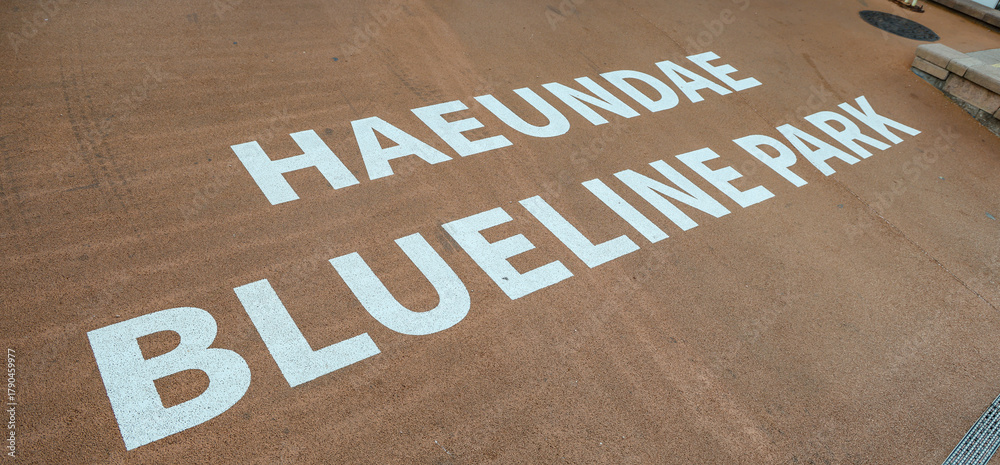 Haeundae Blueline Park name painted in white on the brown ground surface #1790459977