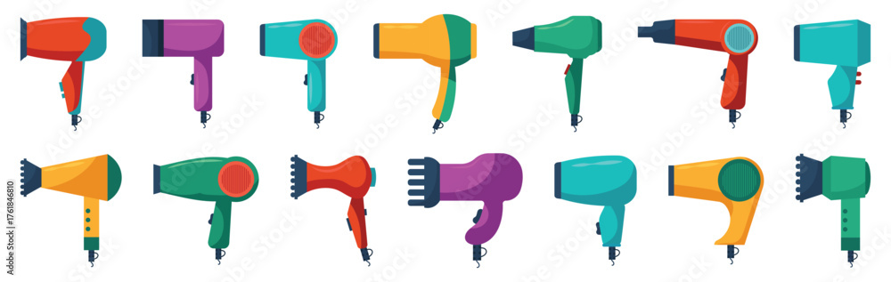 Hair dryer collection in bright colorful style. Various beauty salon blow dryers for hairstyle and grooming themes #1761846810