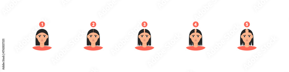 Hair loss stages. Alopecia problem. Baldness vector set. #1763837531